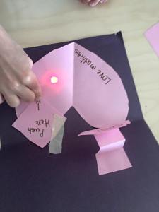 We used paper circuits from Chibitronics to create the circuits behind a shape in the inside of their cards.
