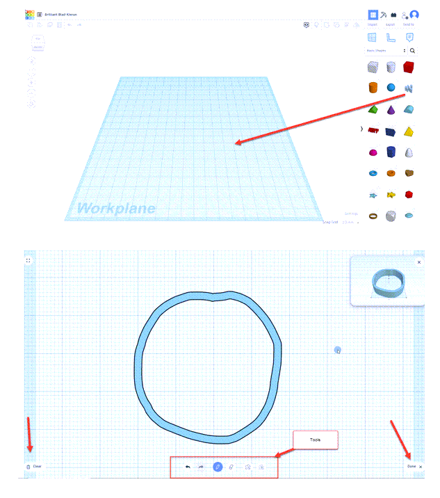 To access the scribble tool in Tinkercad, find it under Basic Shapes and drag it to the workplane.